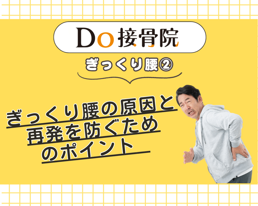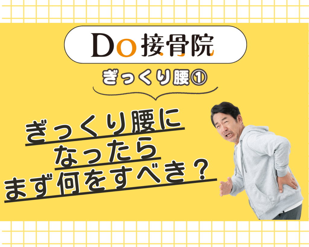 ―正しい対処法とDo接骨院の早期対応― ある日突然、腰に「ピキッ!」と走る激痛――動けなくなって初めて「これがぎっくり腰か…」と感じる方は少なくありません。ぎっくり腰(急性腰痛症)は、発症直後の対処方法によって、その後の回復スピードが大きく変わ... -