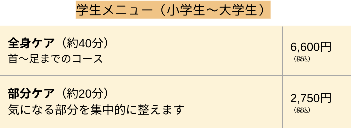 複数メニューの施術をご希望の方は、複数回に分けてのご予約、またはお電話でのご予約をお願い致します。